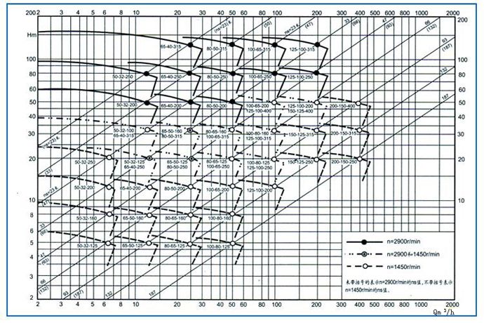 IH型系列泵有29個(gè)基本型,其中22個(gè)雙速(2900、1450r/min)經(jīng)過(guò)A、B兩種型式的葉輪直徑切割變型后,達(dá)112個(gè)規(guī)格。