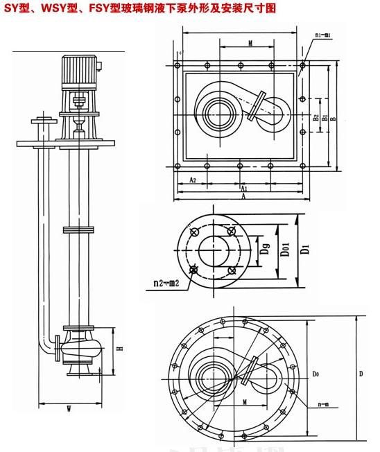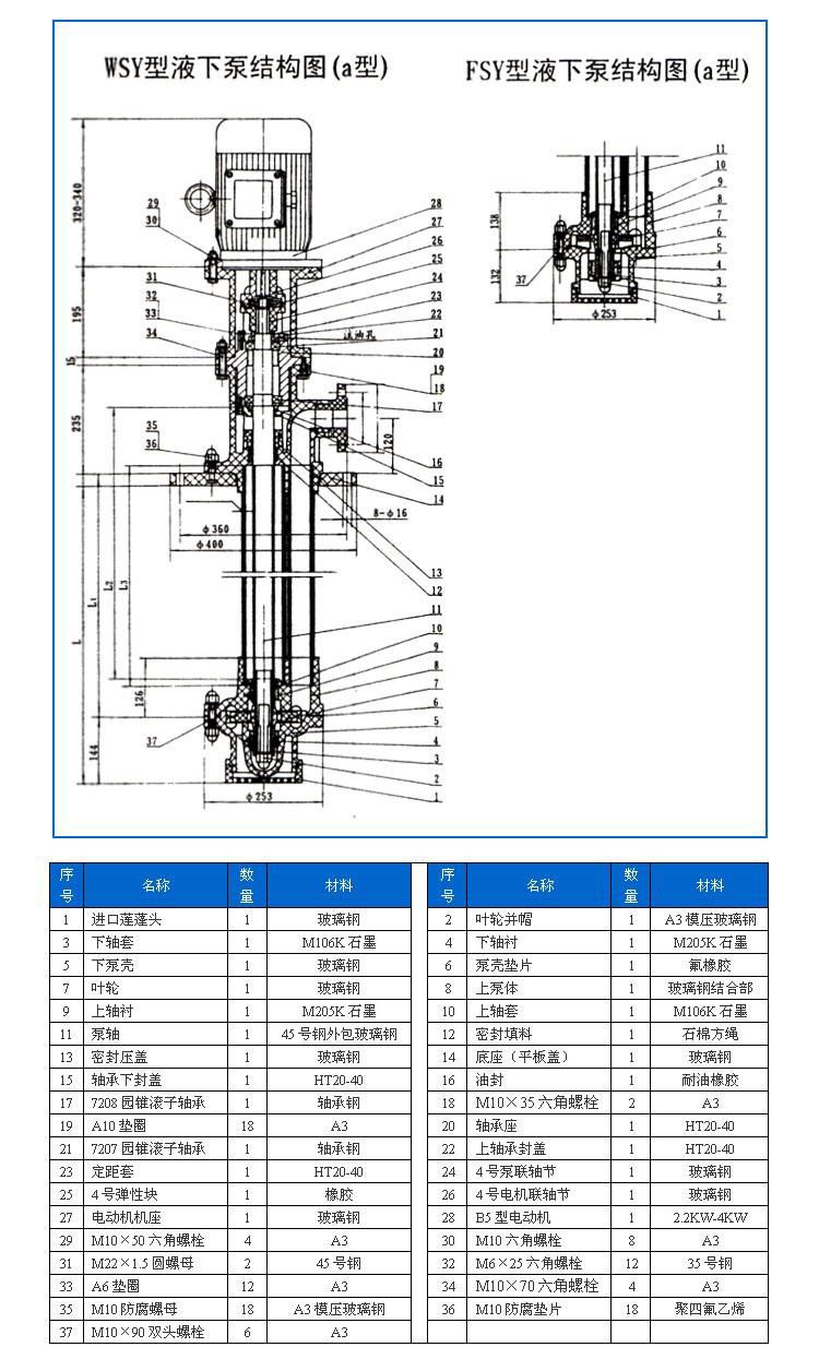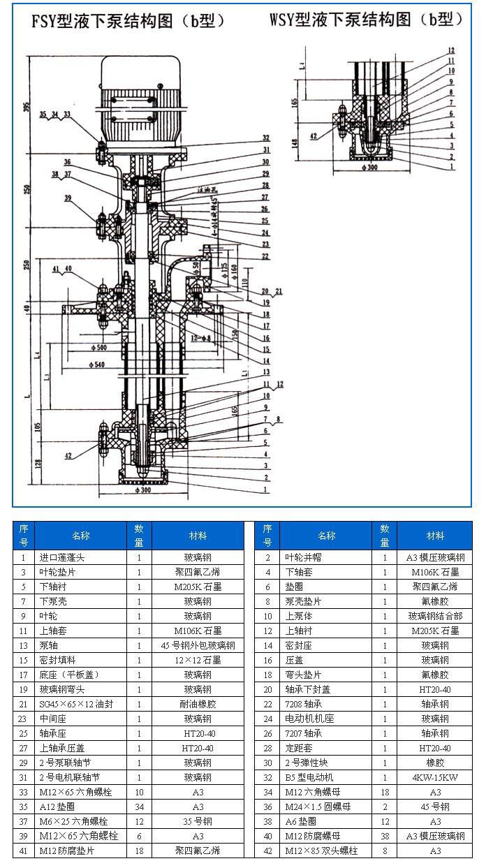 本單位生產(chǎn)的WSY型、FSY型兩種型式的泵,1.WSY型泵為立式玻璃鋼液下旋渦泵。2.FSY型泵為立式玻璃鋼液下離心泵,該泵因伸入貯罐,貯槽的深度長短不同,設(shè)計液下深度800mm##3000mm之間任意選擇。只要液體高于泵體,即可不灌液而起動送液,平蓋板下設(shè)有泄漏孔,液體不會向貯罐外泄漏。