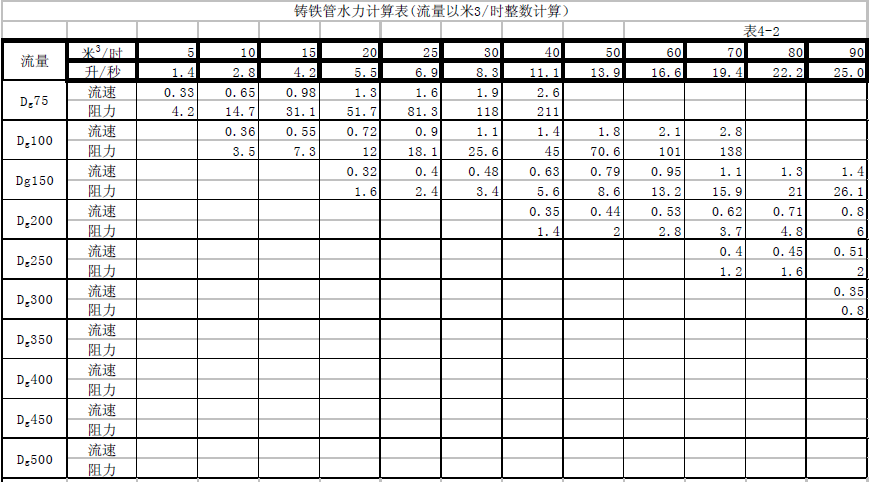 (1)將一條400米長的管道鋪設(shè)在比另一條高5米的斜坡上。這5米的差異產(chǎn)生5米的壓差。因此,如果從高端連續(xù)供水,則管道的流量必須為61.2噸/小時,流量必須為1米/秒。管道的坡道可以表示為5/400(讀作四分之四,400米是坡度的斜率。嚴(yán)格來說,坡度應(yīng)該用水平距離減去高度差來表示,因?yàn)樗骄嚯x略小于400米,因此真實(shí)坡度應(yīng)略大于5/400),但一般管道的坡度以千分之幾表示,5/400可轉(zhuǎn)換為{(5x2。 5)/(400x2.5)} = 12.5因此,該管道的斜率應(yīng)表示為12.51000,縮寫為12.5‰(讀數(shù)為12.5‰)。 該計(jì)算表明,如果Dg150管道以12.5托的斜率鋪設(shè),將確保水流速為1米/秒,流速為61.2噸/小時。 12.5英寸的斜率是管道的每個部分(1000毫米)的12.5毫米的高度差。 這個12.5毫米的水柱是Dg150管道的阻力,流速為61.2噸/小時(見表4)。