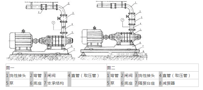 4。為方便維護(hù)和使用安全,應(yīng)在泵的入口和出口管道上安裝調(diào)節(jié)閥,并在泵的入口和出口法蘭上安裝壓力表。對(duì)于高揚(yáng)程泵,為防止水錘,