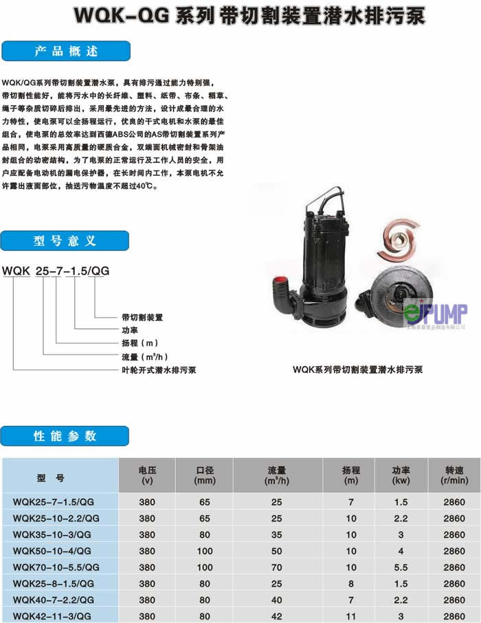 ejiamp /意嘉牌化糞池防堵塞排污泵由電動機,蝸殼泵等主要部件組成意嘉泵業(yè)生產(chǎn)的WQK化糞池無堵塞排污泵具有特殊的排污能力