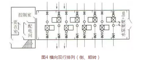 橫向雙行排列布置緊湊,泵房面積小,管件少,水力條件好,但泵房跨度大,需安裝橋式吊車。橫向雙行排列主要適用于采用雙吸離心泵的圓形取水泵房,采用這種布置可節(jié)省較多的基建造價。應(yīng)該指出,這種布置形式兩行泵的轉(zhuǎn)向從電機方向看去是彼此相反的,因此,在泵訂貨時應(yīng)向水泵廠特別說明,以便水泵廠配置不同轉(zhuǎn)向的軸套止鎖裝置,各部分尺寸要求,可參考橫向單行排列的有關(guān)規(guī)定。