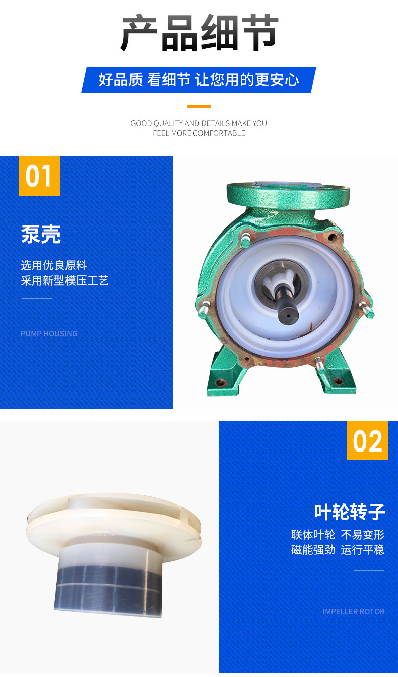 堅固耐用的泵體結構雖然接觸液體部分是氟塑料,但泵外殼是金屬材料,故泵體足以承受管道的重量及抵受機械性沖擊。