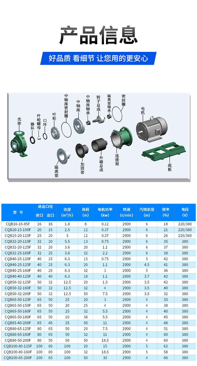 ejiamp/意嘉襯氟磁力泵CQB65-50-125F驅動裝置采用主動磁鐵聯(lián)軸器直接裝在電機軸上,離心泵室完全封閉,通過磁力偶合間接氟塑料磁力驅動泵軸上帶磁鐵的葉輪旋轉結構緊湊、安全節(jié)能。