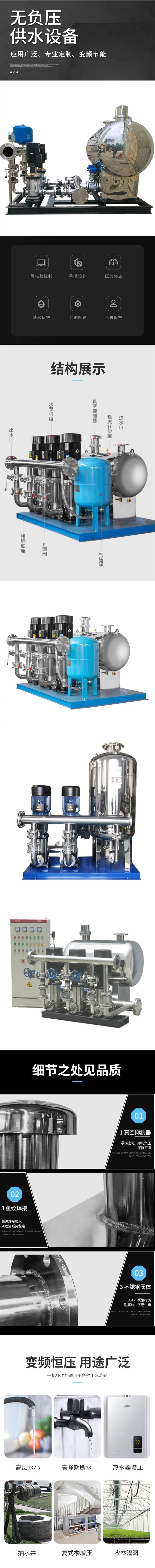 8、優(yōu)越的綜合特性:直接向用戶供水,避免水質(zhì)二次污染;管網(wǎng)常壓供水,可避免外露管路凍裂;可按需要任意調(diào)節(jié)設備壓力,滿足用水高峰期建筑頂層的水壓要求;另外該設備品種,可任意組合配套,應用。