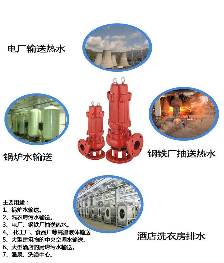 耐高溫排污泵WQR是我公司上海意嘉泵業(yè)制造有限公司生產的一種耐溫達高100℃材質為鑄鐵的一款耐高溫排污泵,此款產品具有抽送介質溫度高、安裝移動方便、高效節(jié)能、防纏繞、無堵塞等特點。可用于輸送含污物、固體顆粒、纖維的高溫液體介質。眾所周知目前市面上的排污泵只能輸送介質溫度為常溫或40℃以內的介質,我們上海意嘉泵業(yè)生產的這款WQR耐高溫排污泵就很好解決了一些用戶介質溫度在40-100℃度之間不能使用潛水排污泵只能改過其它類型水泵的問題。(我公司生產的不銹鋼耐高溫排污泵最高可達120℃)