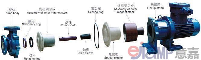 驅動裝置采用主動磁鐵聯(lián)軸器直接裝在電機軸上,泵室完全封閉,通過磁力偶合間接氟塑料磁力驅動泵軸上帶磁鐵的葉輪旋轉結構緊湊、安全節(jié)能。