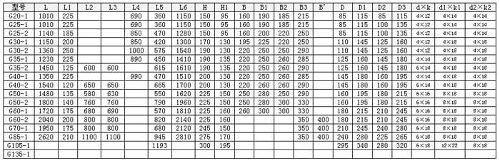 | G105-1 | 380 | 80 | 15-4級/齒輪箱 | 380 | 65 | 22-4級/齒輪箱 | 29~290 | 3~50 | 22 |