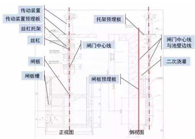 a、基礎(chǔ)交接檢查,重點(diǎn)是控制項(xiàng)有標(biāo)高、中心線位置,具體到閘門為閘門傳動裝置預(yù)埋件、絲杠托架預(yù)埋件、閘板槽預(yù)埋件與中心線位置偏差;池壁(絲杠托架、閘板槽預(yù)埋板)與閘門中心線位置偏差;
