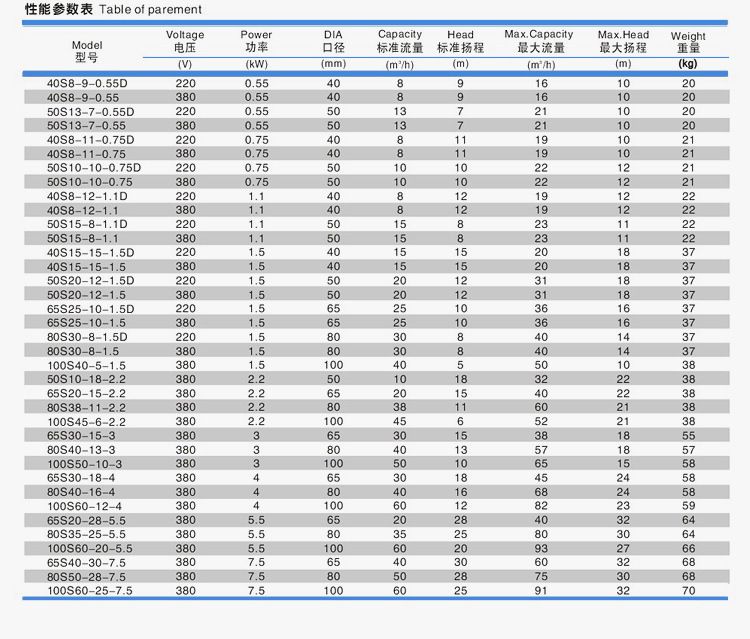 型號 | 電壓 | 功率 | 出口 | 標(biāo)準(zhǔn)流量 | 標(biāo)準(zhǔn)揚(yáng)程 | 最大流量 | 最大揚(yáng)程 | 重量 |