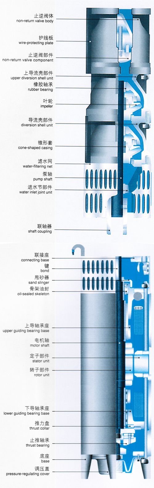 3、為防止泥砂浸入電機(jī),在電機(jī)上端裝有甩砂器和骨架油封,組成了防砂機(jī)構(gòu),整個(gè)電機(jī)系密封結(jié)構(gòu)。